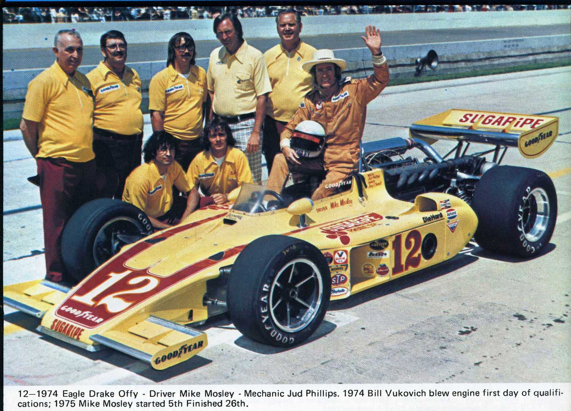 - Originally Sold by Dan Gurney's All American Racers (Santa Ana, CA) to native Californian and long time race team owner Jerry O'Connell (Sugaripe Prune) for Driver Mike Mosley and Chief Mechanic Judd Phillips. Mosley campaigned chassis 74-08 during the most of 1975 season with 4 Top Ten finishes, 2 podium finishes, and the race winner of the 1975 Toney Bettenhausen 200 ( Milwaukee Mile).