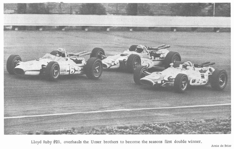 1968 - Car #25, Gene White Special Potential results Las Vegas Raceway, March 31: Lloyd Ruby, 8-4, 49 laps Mosport Park, June 15, Race 1: Lloyd Ruby, 9-15 14 laps Mosport Park, June 15, Race 2: Lloyd Ruby, 9-12 13 laps Langhorne Speedway, June 23: Lloyd Ruby, 6-21, 6 laps Continental Divide Raceway, July 7: Lloyd Ruby, 7-2, 57 laps Indianapolis Raceway Park, July 21, Race 1: Lloyd Ruby, 4-23, 1 lap Indianapolis Raceway Park, July 21, Race 1: Lloyd Ruby, 4-15, 30 laps St. Jovite, August 4, Race 1: Lloyd Ruby, 5-19, 4 laps St. Jovite, August 4, Race 1: Lloyd Ruby, 14-14, 5 laps