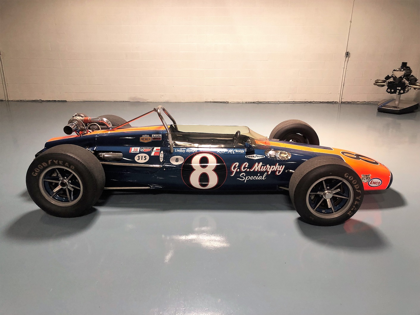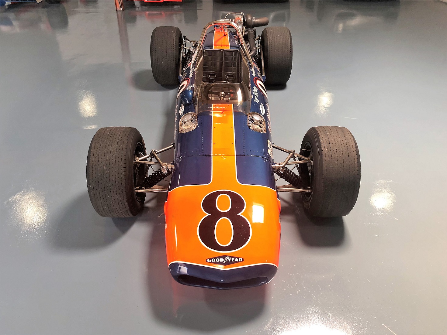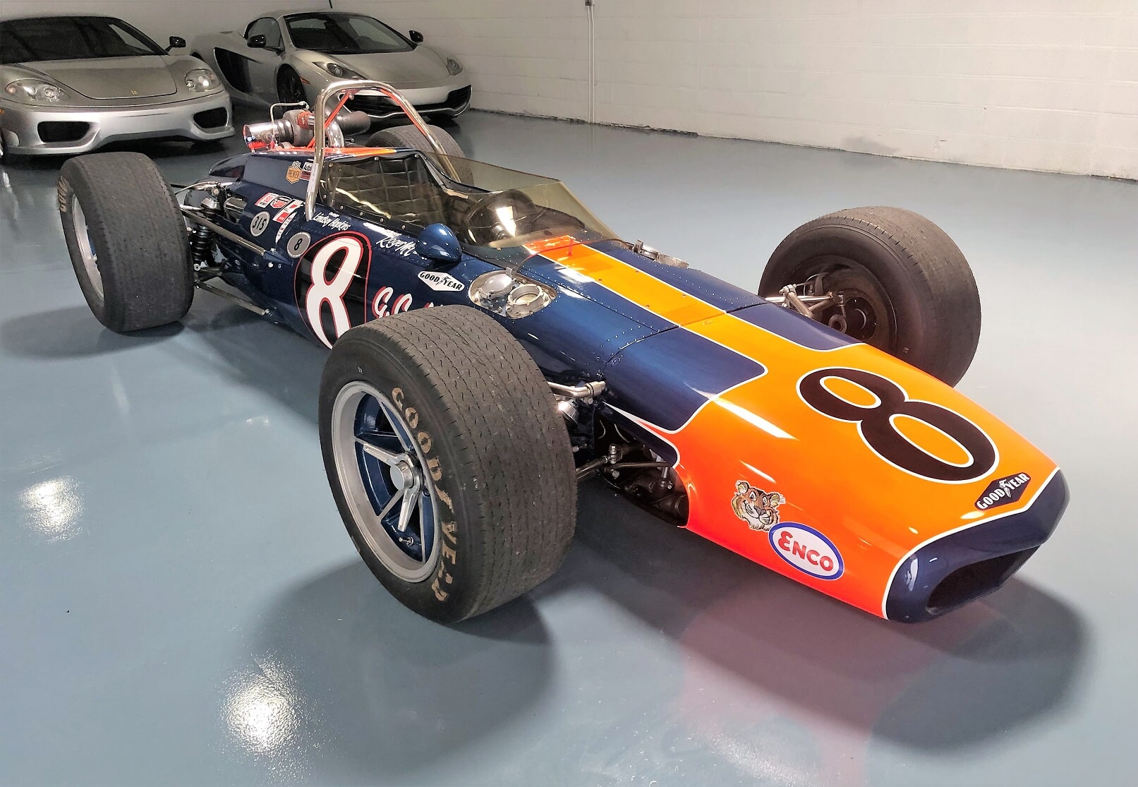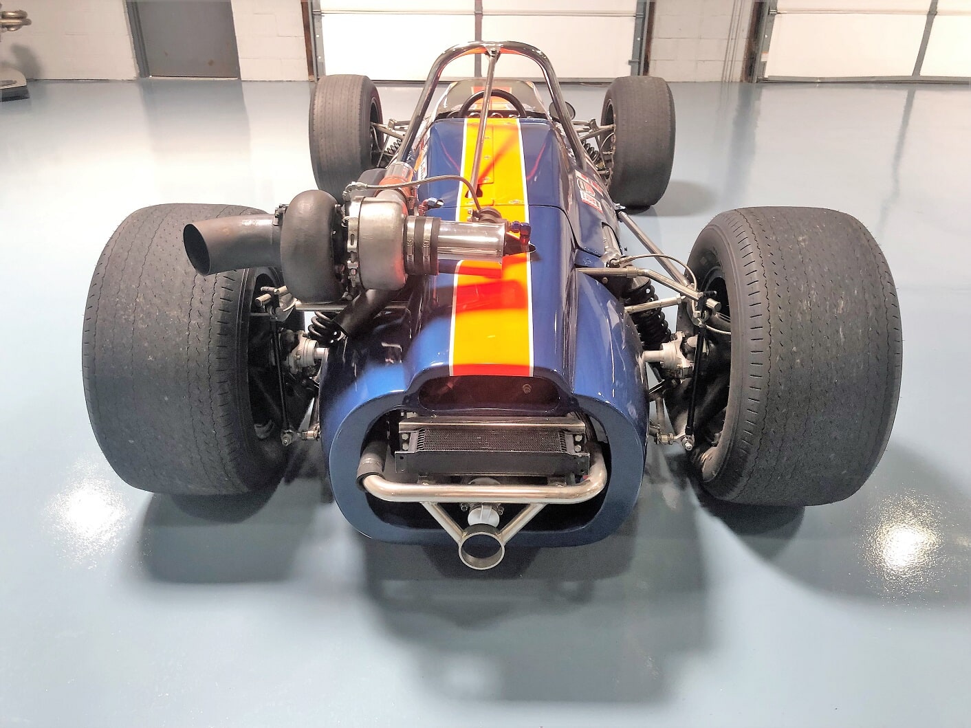 Dan Gurney's 1st 1968 Eagle (Chassis 40-1) produced for the legendary team owner, Lindsey Hopkins,of the Coca Cola Fortune. At the 1968 Indianapolis 500, McCluskey originally tried to qualify this car with a normally aspirated Ford 4 Cam but was unable to get the car up to competitive speeds. The decision was made to install a more powerful turbo Offenhauser engine. As a result, Roger McCluskey qualified this car 7th for the 1968 Indy 500 and ran as high as 2nd place before being sidelined with a cooler leak. McCluskey campaigned this car for the 1968 season with many top ten finishes and several podiums. If desired, a normally aspirated Ford 4 Cam can be reinstalled as the chassis retains it's original engine mounts.