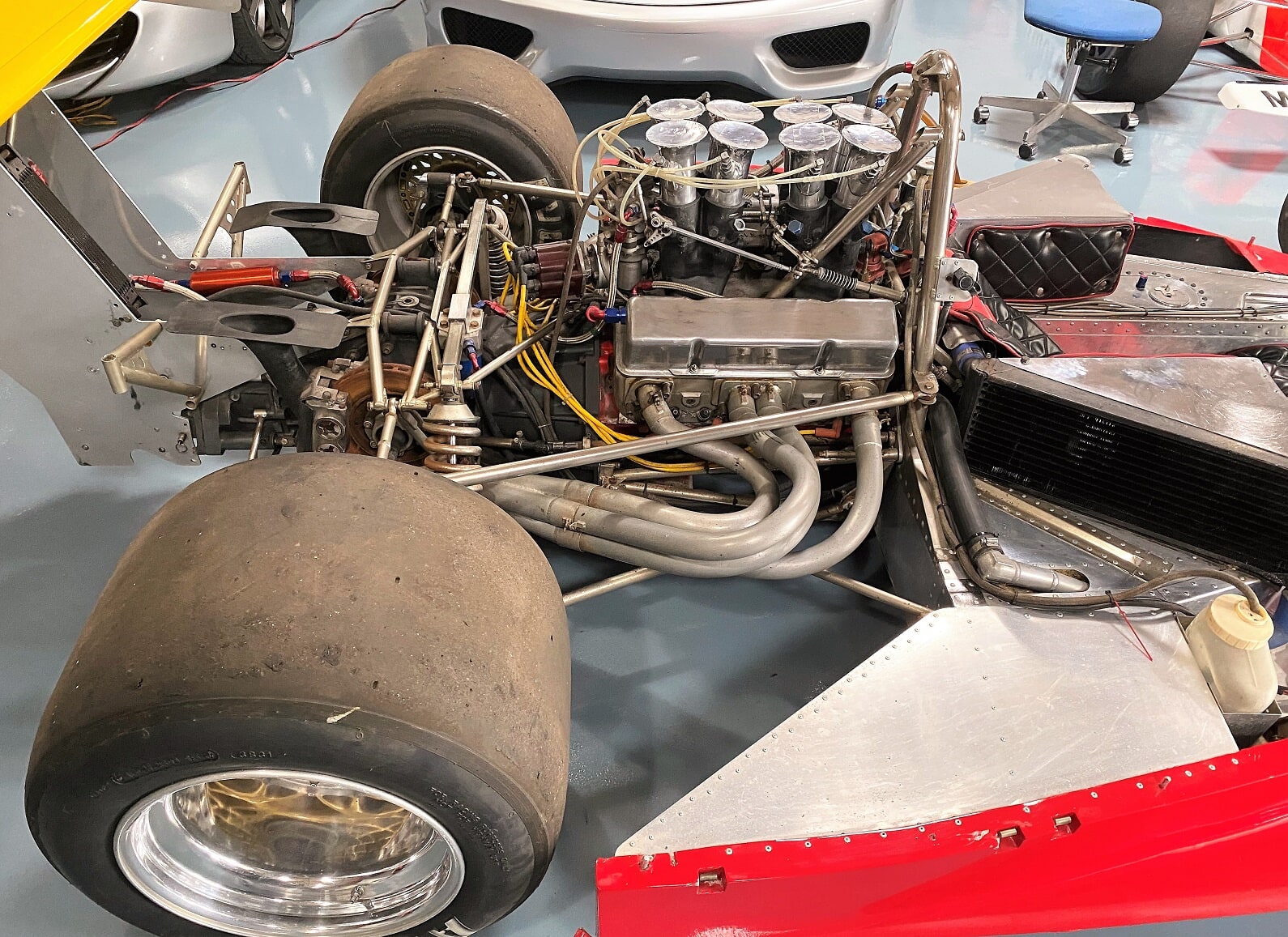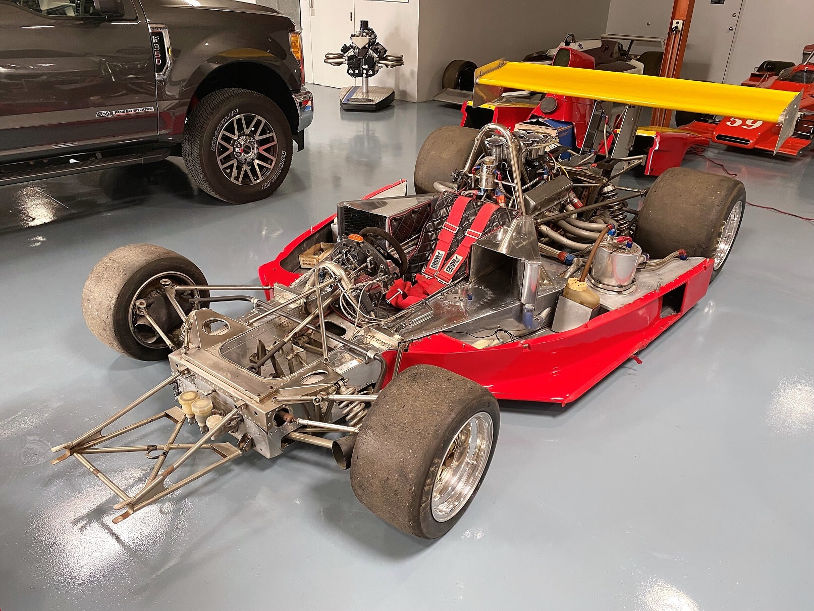 Chevy 305 race engine built by Donner Motor Sports. It has a race quality cast iron block, aluminum Brodix heads ported by Paul, Lucas McKay mechanical timed fuel injection with magnesium intake manifold and spun aluminum intake trumpets. Also has B.R.C. pistons, Carrilo rods, Manley valves, Jessel rocker arms, and a Weaver Bros. dry sump pump.