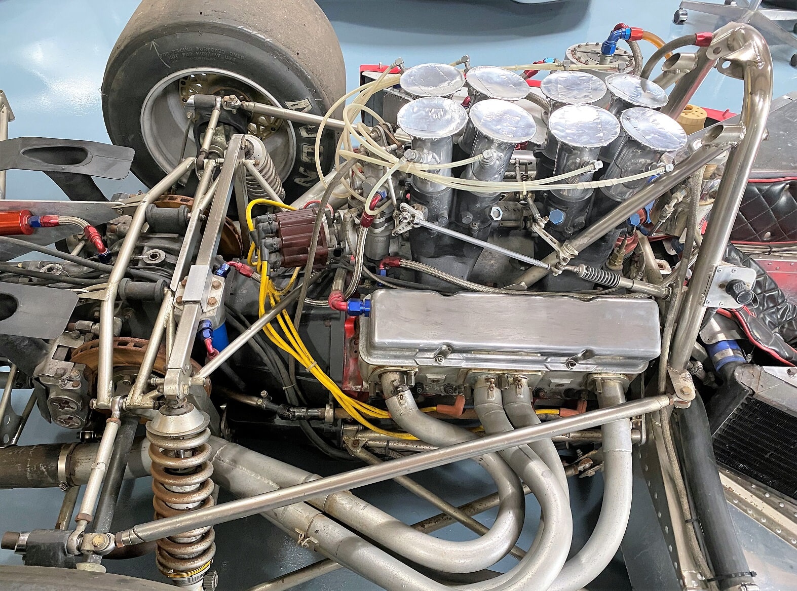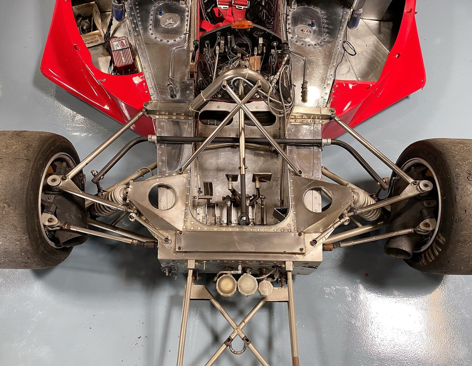Front unequal length top and bottom a-arms with coil over Koni aluminum double adjustable shocks. Rear twin trailing arms single top link and twin bottom links. Uprights are Lola magnesium and axles have single wheel retention knock off nuts.